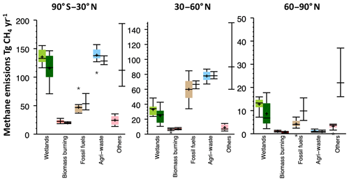 Figura 3: Comparación entre las emisiones de metano estimadas con un enfoque de “arriba abajo” (satélites, barra de la derecha en cada categoría) y de “abajo a arriba” (inventarios, barra de la izquierda en cada categoría), en función de la latitud, en la década 2008-2017. Fuente: balance global de metano