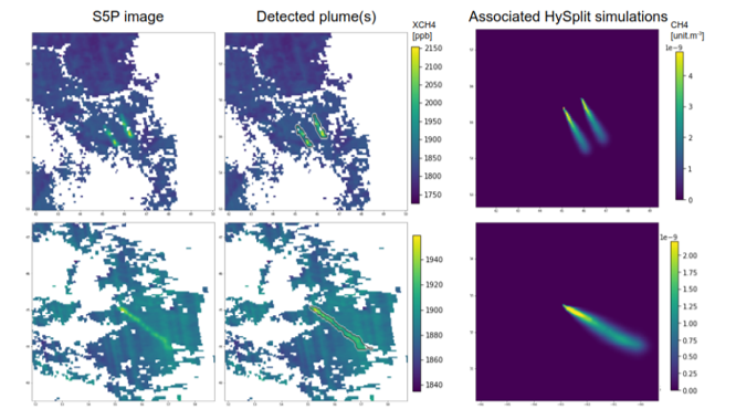 Figura 2. Imagen obtenida del satélite (izquierda), detección del penacho de emisión (centro) y simulación de la emisión según el modelo de dispersión (derecha). Fuente: y Lavaux et al., 2020