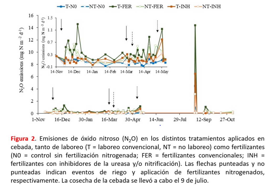Numerosas revisiones y meta-análisis nos han sintetizado el efecto del laboreo de conservación (en relación al laboreo tradicional) en multitud de condiciones ambientales y de manejo, y sobre parámetros tanto agronómicos como ambientales (incluyendo emisiones de gases de efecto invernadero). Si bien la mayoría de estudios se basan en ensayos de media o larga duración, los efectos durante el año de transición a siembra directa y los mecanismos implicados apenas se conocen. En un reciente ensayo llevado a cabo por el grupo COAPA (UPM/CEIGRAM) se evaluaron distintas estrategias de fertilización en combinación con dos manejos diferentes de suelo: laboreo convencional y siembra directa (en el primer año de conversión). El lugar elegido fue Madrid (Centro Nacional de Tecnología de Regadíos CENTER, en San Fernando de Henares), y el cultivo elegido fue cebada, sembrada en otoño tras haberse cultivado colza en la misma parcela en la campaña previa. Como estrategias de fertilización, se compararon manejo convencional (urea en fondo y nitrato amónico cálcico en cobertera), uso de fertilizantes con inhibidores (urea con doble inhibidor DMPSA + NBPT en fondo, y CAN con inhibidor DMPSA en cobertera) y un control sin fertilización nitrogenada. La dosis total en los tratamientos fertilizados fue de 120 kg N/ha (40 en fondo y 80 en cobertera).